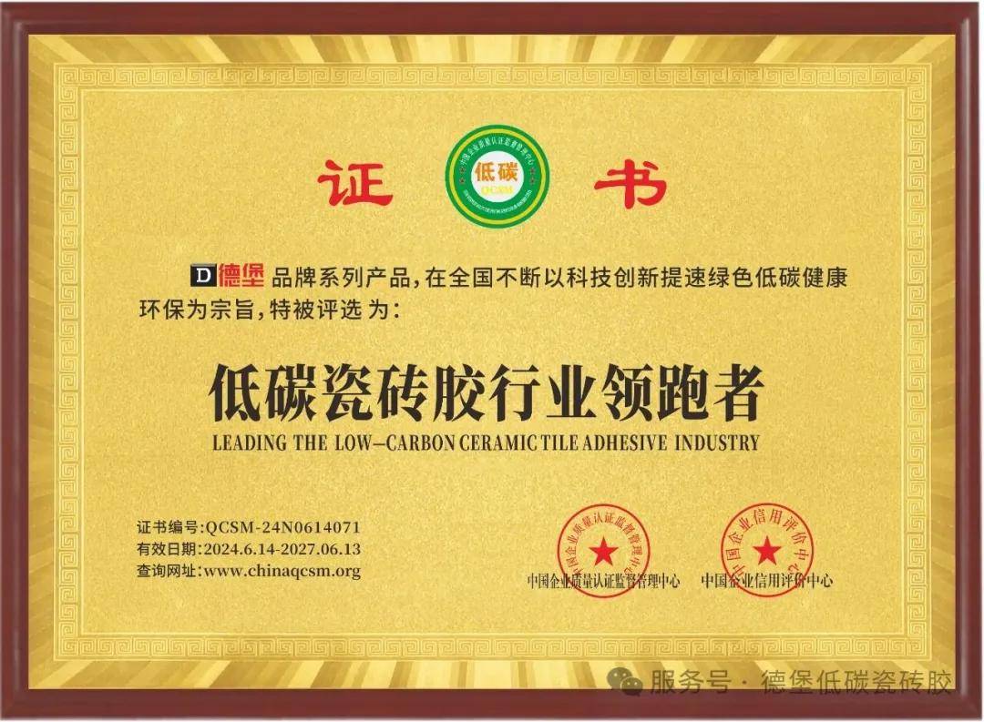 “中国低碳产物认证:市场的承认虽然主要,但国度的权势巨子认证更是对德堡二十年低碳之的最高褒。“中国低碳产物”是基于全生命周期,能源、和质量属性的分析评价。获得该认证,意味着德堡瓷砖胶从原材料获取、出产、利用到烧毁处置的整个生命周期,均合适高尺度的要求,是颠末国度背书、名副其实的“绿色卫士”。