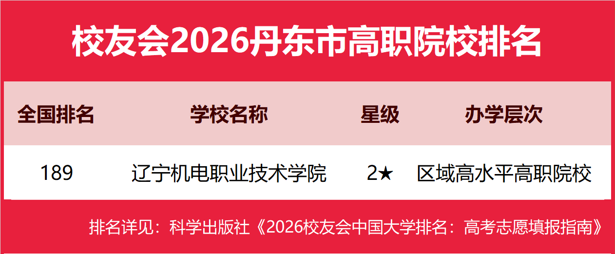 正在校友会2026中国高职院校排名中,辽宁机电职业手艺学院全国排名第189名,雄居校友会2026丹东市高职院校排名第一。